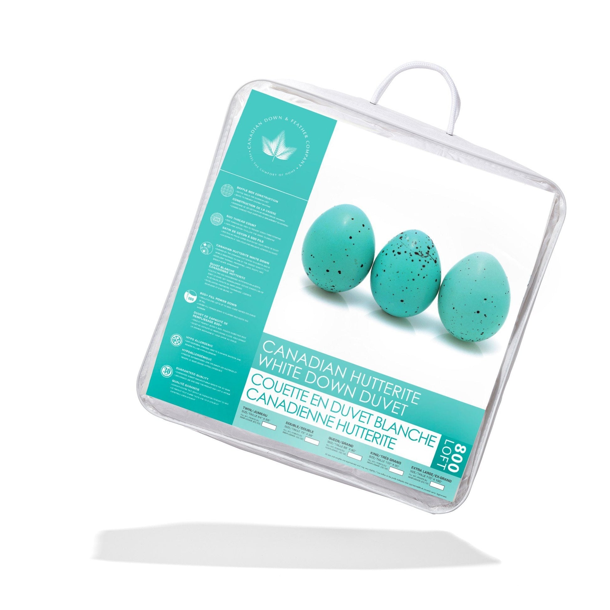 This duvet is made with care in Canada with Canadian fill. The shell is 500 thread count cotton – soft and quiet. The shell is filled with 800 loft duck down farmed by Hutterites in Alberta, Canada. Down fill is soft and luxurious, made up of tiny, fluffy clusters. The fill is very high loft, which means it is high quality and very warm per ounce. This is why you’ll find this duvet is very lightweight. Just a little bit of fill goes a long way in terms of warmth!