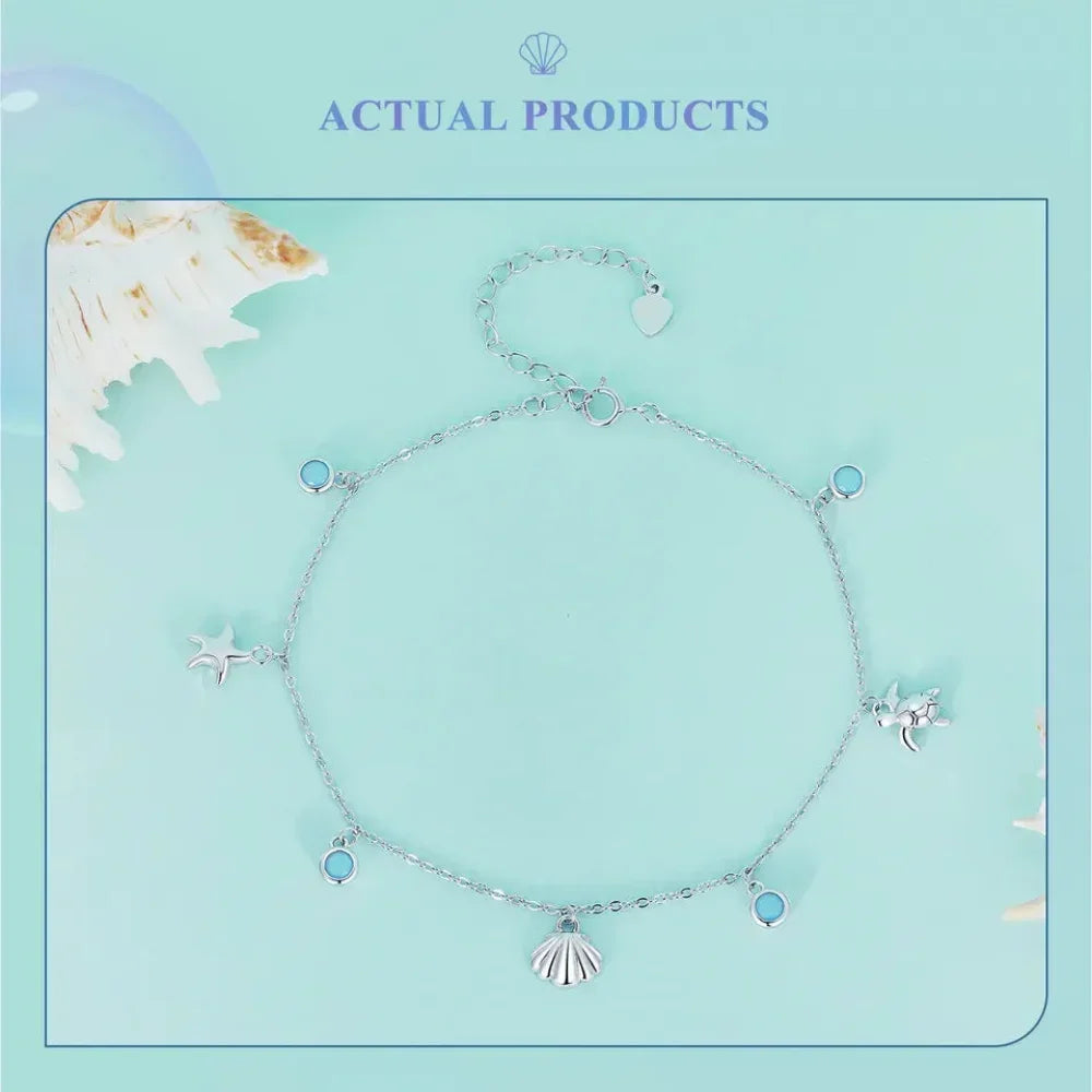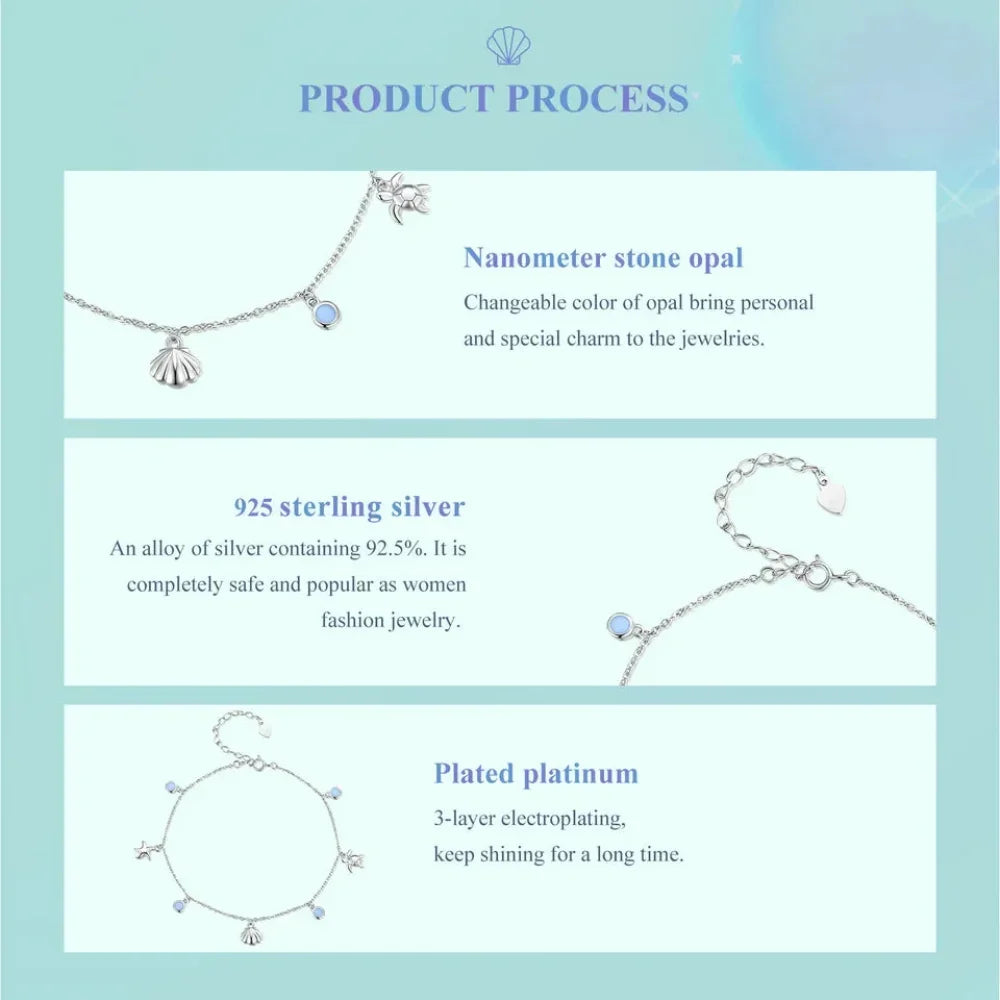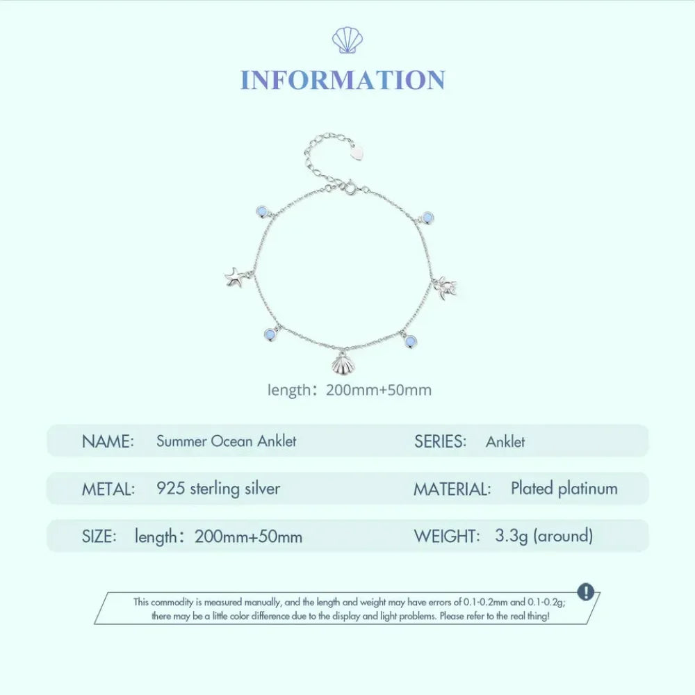 Experience the allure of our Summer Ocean Anklet featuring a seastar and shell pendant. Adorned with a small blue nanometer opal, this anklet captures the essence of a dreamy summer. Crafted from 925 Sterling Silver and plated with platinum, it's an ideal gift for teen girls, girlfriends, best friends, sisters, and daughters.