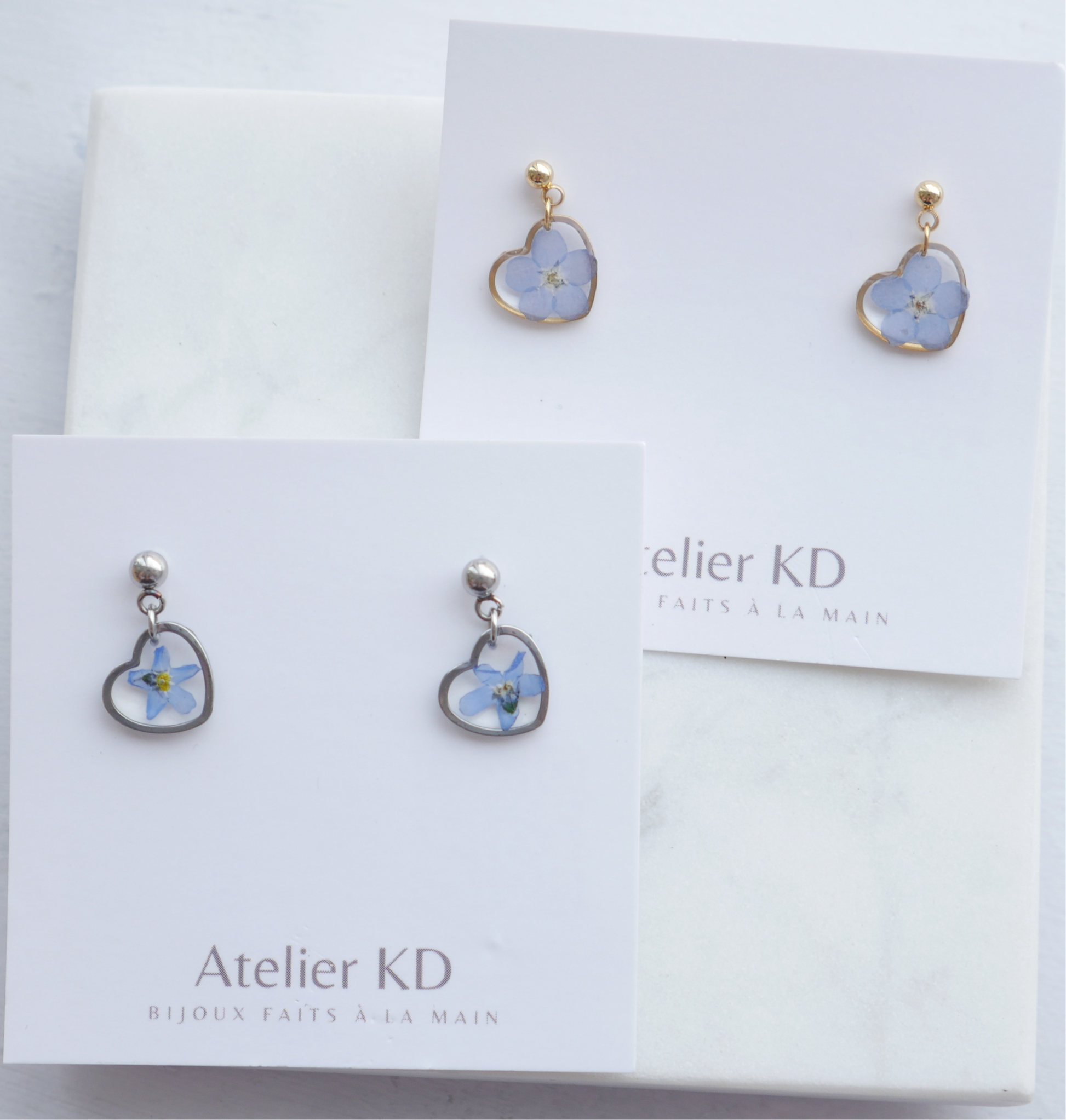 Boucles d’oreilles Mia - fleurs de myosotis - coeur (petit 12mm)