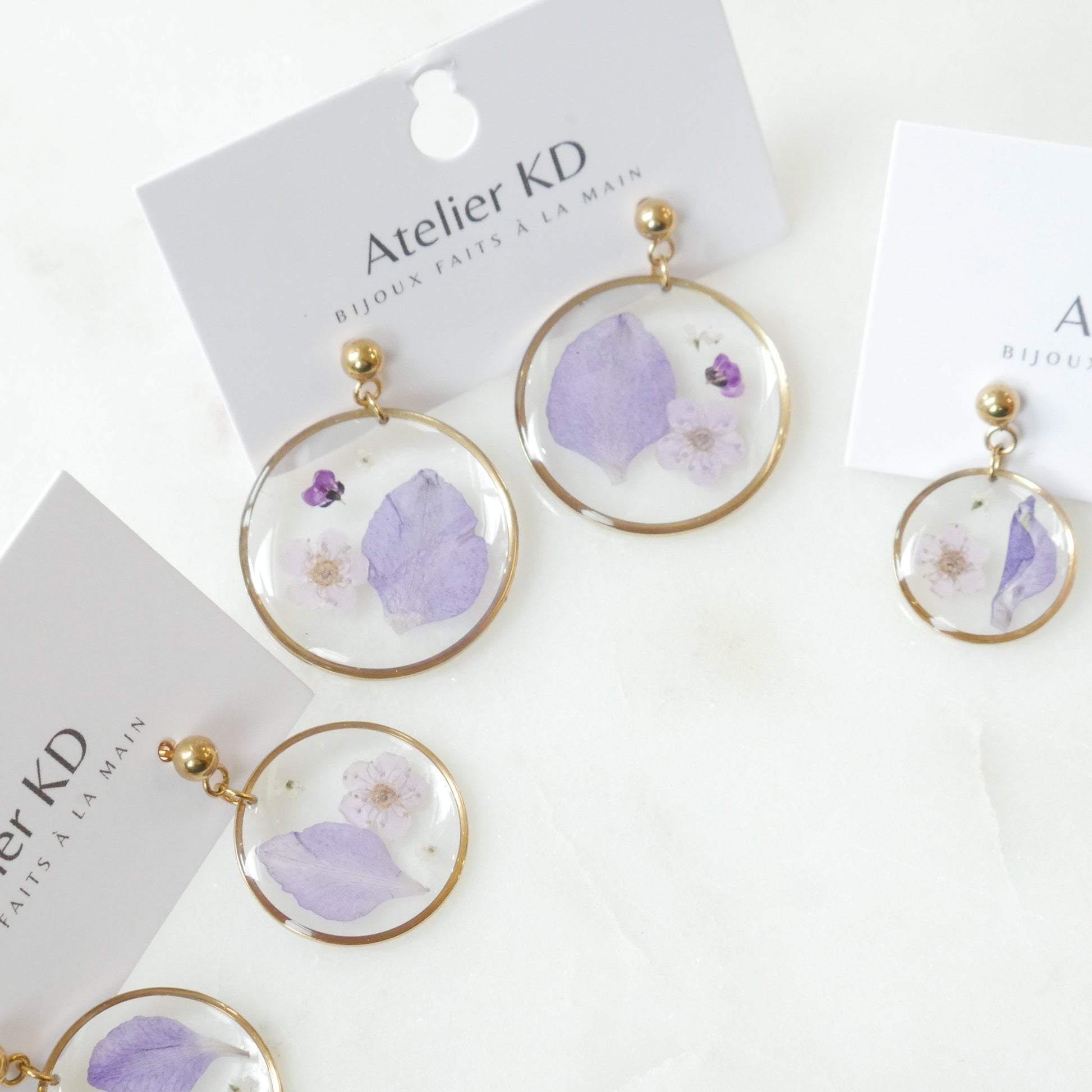 Boucles d’Oreilles en résine incrustées de fleurs séchées.