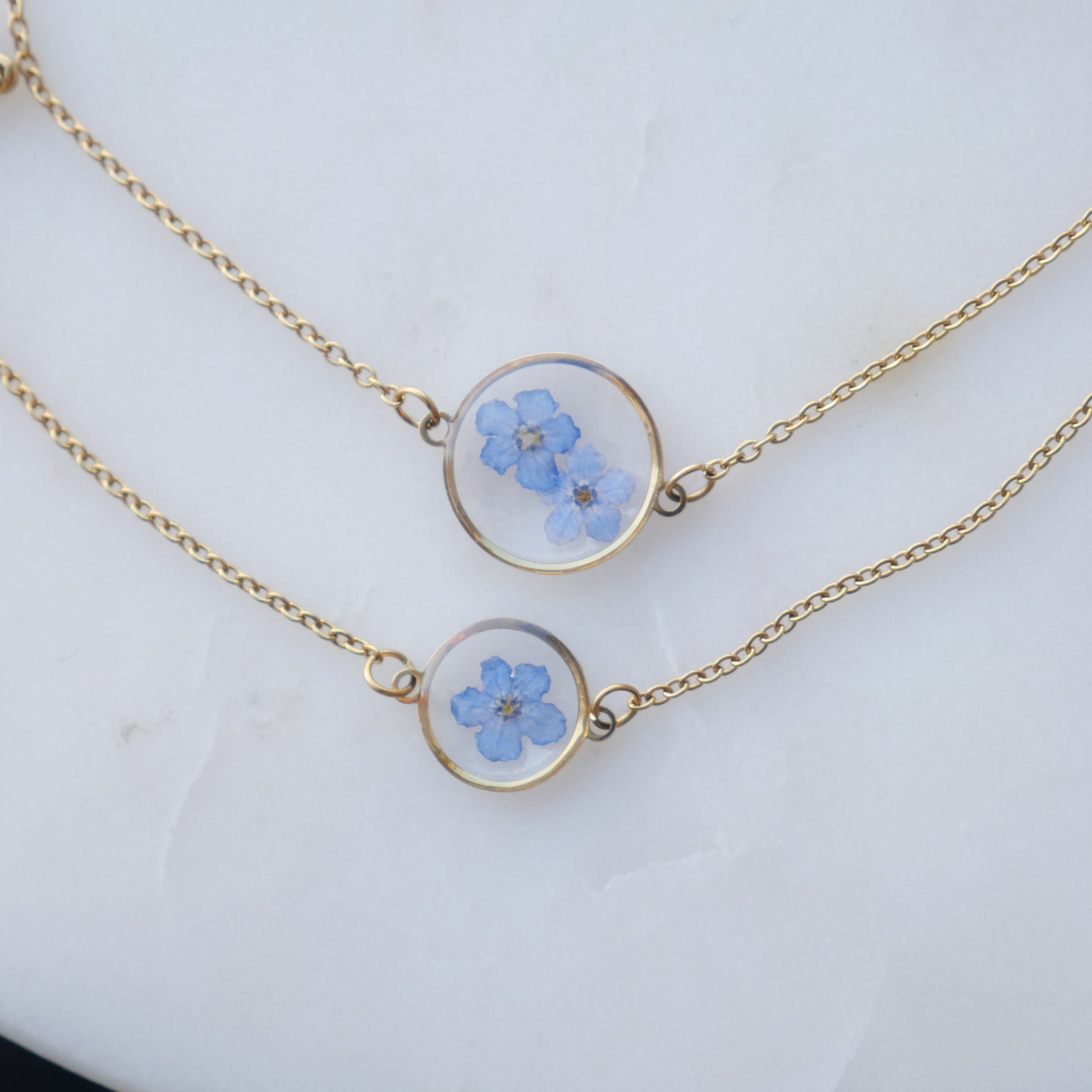 Bracelet en résine, fin et délicat incrusté de fleur myosotis séchées.