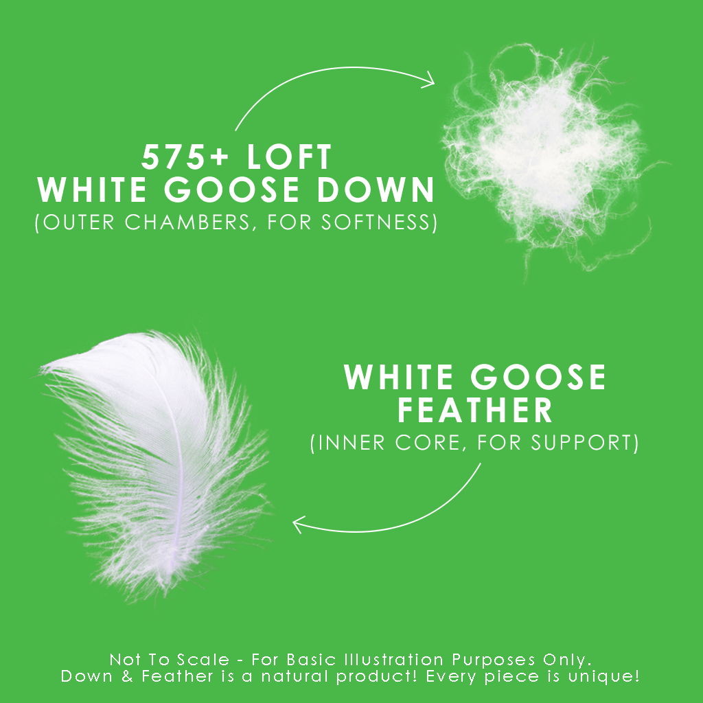 - White Goose Down: Outer Chambers filled with high loft White Goose Down provide the softness and luxury you want (approx 10% of total weight)