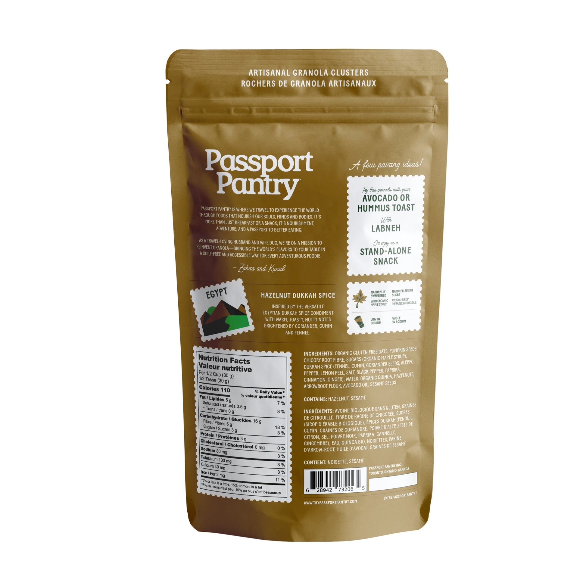 INGREDIENTS: Organic Gluten Free Oats, Pumpkin Seeds, Chicory Root Fibre, Sugars (Organic Maple Syrup), Dukkah Spice (Fennel, Cumin, Coriander Seeds, Aleppo Pepper, Lemon Peel, Salt, Black Pepper, Paprika, Cinnamon, Ginger), Water, Organic Quinoa, Hazelnuts, Arrowroot Flour, Avocado Oil, Sesame Seeds