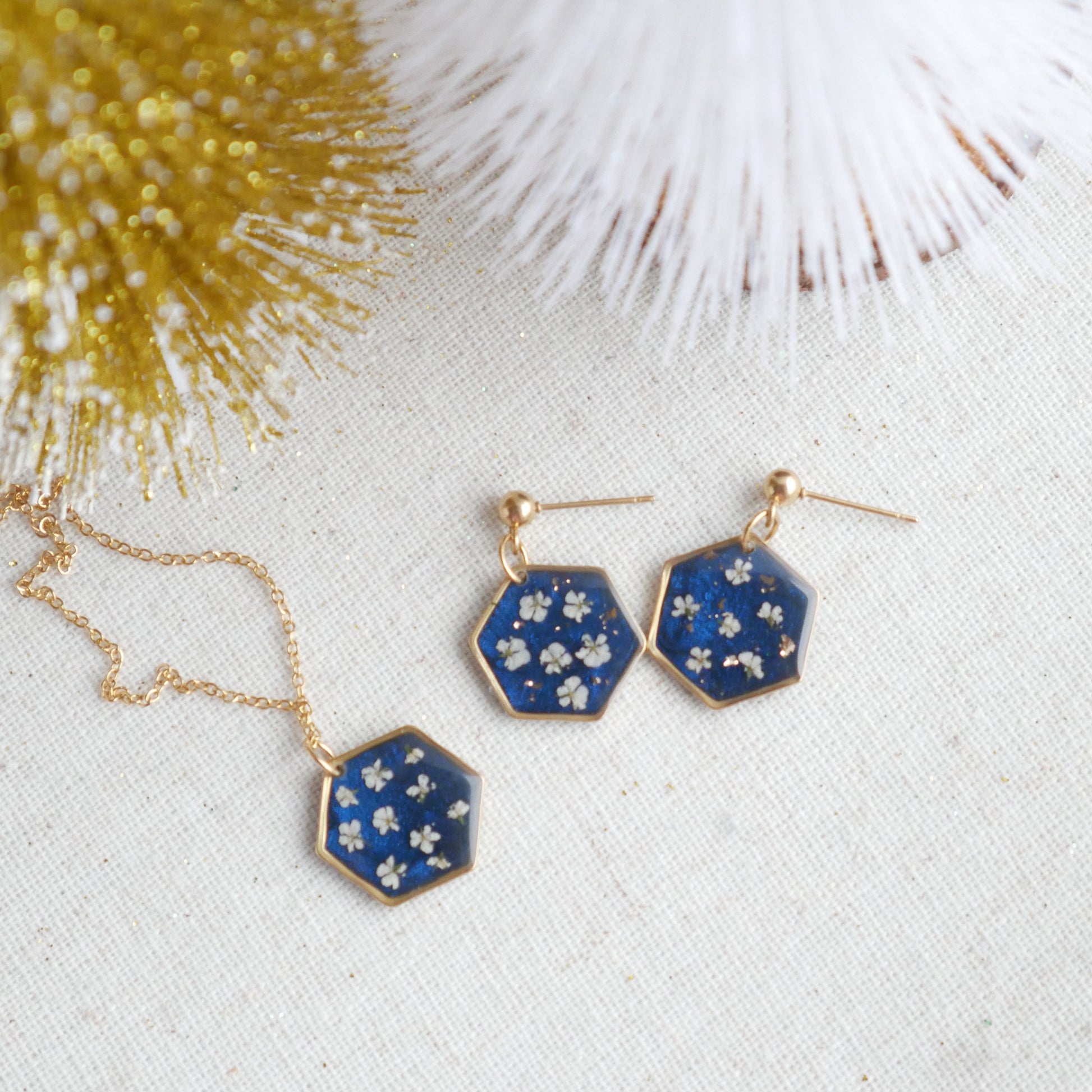 Boucles d’Oreilles en résine, incrustée de fleurs de carottes et feuille d'or.