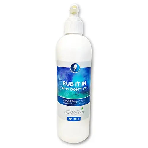 Rub it in Why Don’t Ya! Lotion was formulated specifically for our daughter, Lowen (i.e. safe for kiddies as well as adults). This face + body lotion is all-natural, paraben free, non-toxic, non-comedogenic (meaning it won’t make your face look like a 16 yr old pizza delivery boy). Void of any added fragrances or colors. All this combined (with minimal preservation) makes “Rub It In Why Don’t Ya!” the cleanest, safest and most effective lotion on the market! Sure yea, we are aware of our bias…