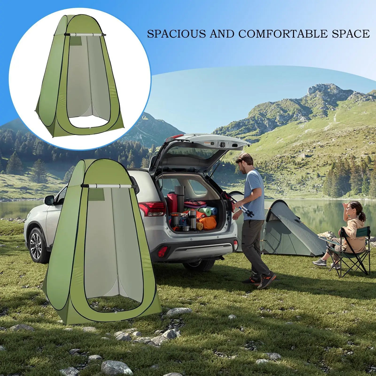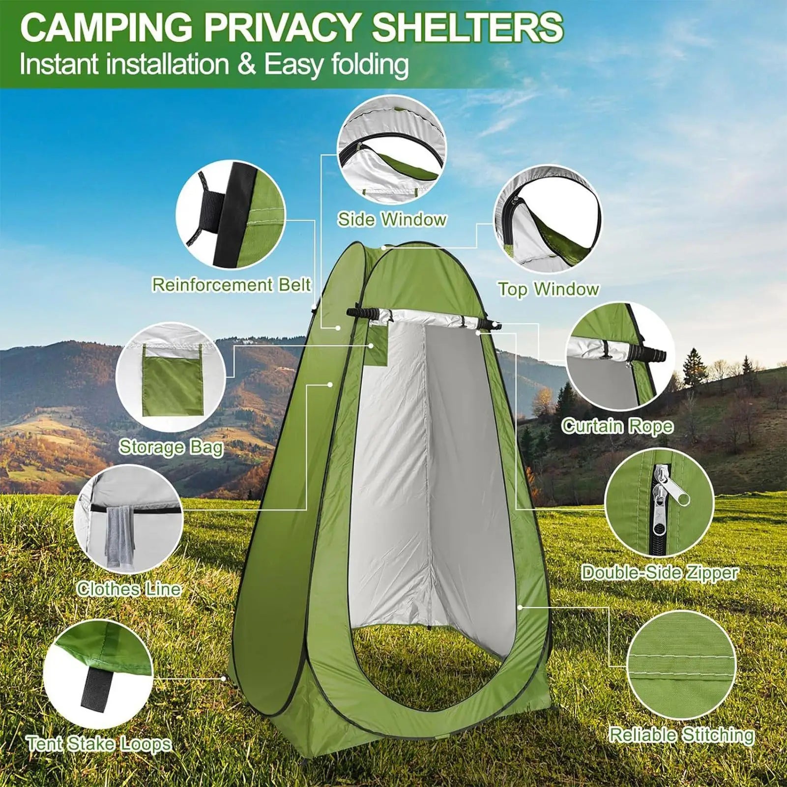 1.Portable Quick Assembly: Featuring effortless deployment and instant shelter assembly, this privacy shower tent ensures quick setup and easy portability for outdoor activities